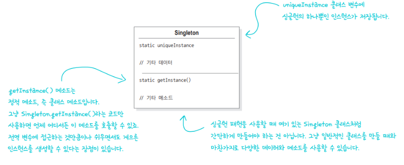 특정 클래스에 객체 인스턴스가 하나만 만들어지도록 해주는 패턴입니다. 싱글턴 패턴을 사용하면 전역 변수를 사용할 때와 마찬가지로 객체 인스턴스를 어디서든지 액세스 할 수 있게 만들 수 있습니다. 클래스 인스턴스를 하나만 만들고 그 인스턴스로의 전역 접근을 제공합니다.