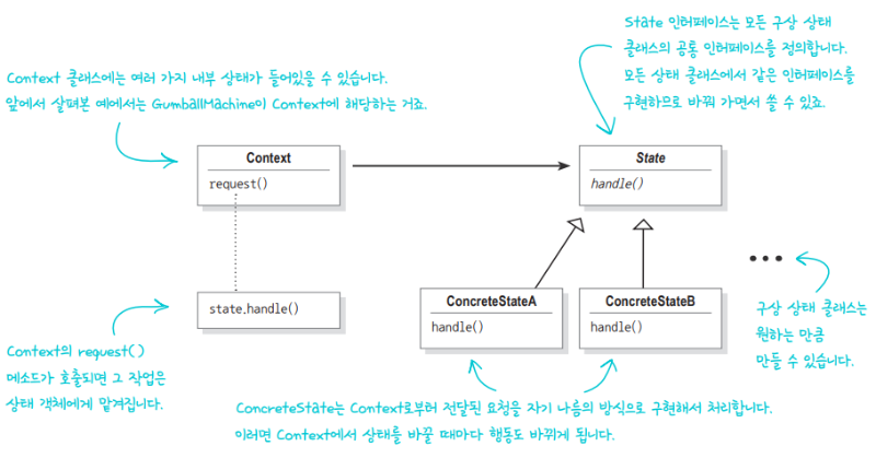 상태 패턴을 사용하면 객체의 내부 상태가 바뀜에 따라서 객체의 행동을 바꿀 수 있습니다. 마치 객체의 클래스가 바뀌는 것과 같은 결과를 얻을 수 있습니다.