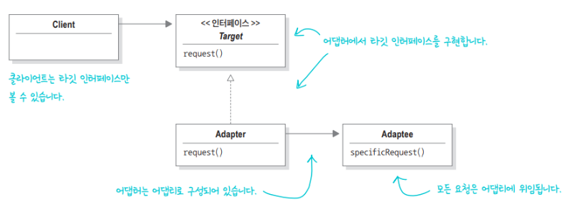 특정 틀래스 인터페이스를 클라이언트에서 요구하는 다른 인터페이스로 변환합니다. 인터페이스가 호환되지 않아 같이 쓸 수 없었던 클래스를 사용할 수 있게 도와줍니다.