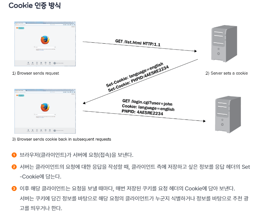 인증에는 클라이언트의 쿠키 저장소에 Key-Value 형식의 문자열 방식을 저장시켜 고유 정보 식별 가능!
