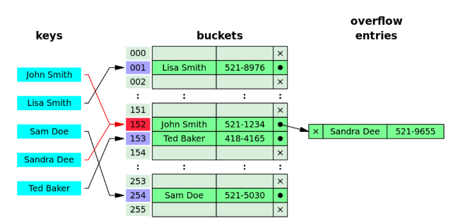 - 두 개 이상의 키가 동일한 해시 값을 가질 경우 충돌이 발생합니다. 충돌을 관리하는 많은 방법들이 있지만, 충돌이 빈번하게 발생할 경우 성능 저하를 가져올 수 있습니다.